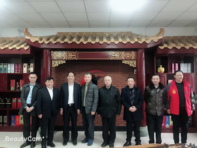 勁牌酒業(yè)股份有限公司董事長(zhǎng)吳少勛(左三)等與公司董事長(zhǎng)魏云飛(右三)在瀘州鑫霸實(shí)業(yè)公司合影